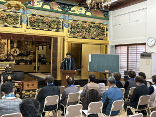 | 講師は正念寺・副住職の藤勇輝先生。 「他力本願・念仏・聞法」について、 お話していただきました。 . |